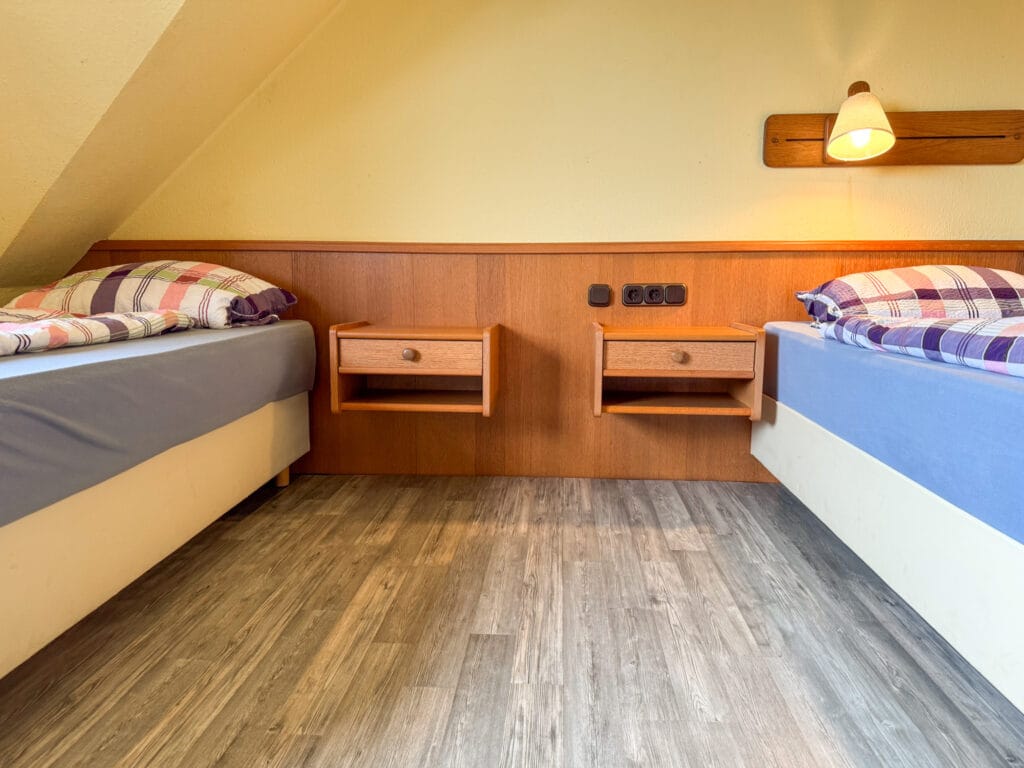 • Comfortable Sleeping Arrangements: Two single boxspring beds with matching bedside tables.